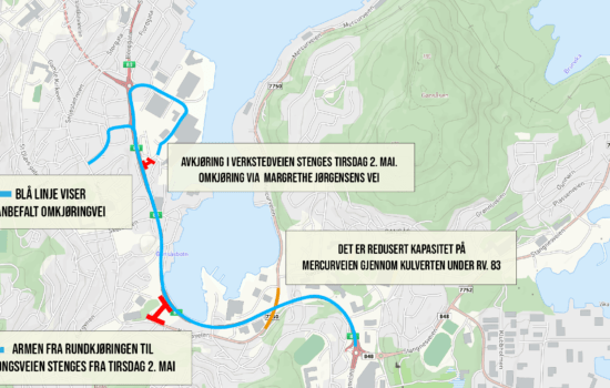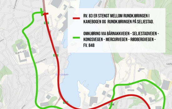 Kart over stengninger og anbefalte omkjøringsveier Arbeidene langs rv. 83 går fremover.